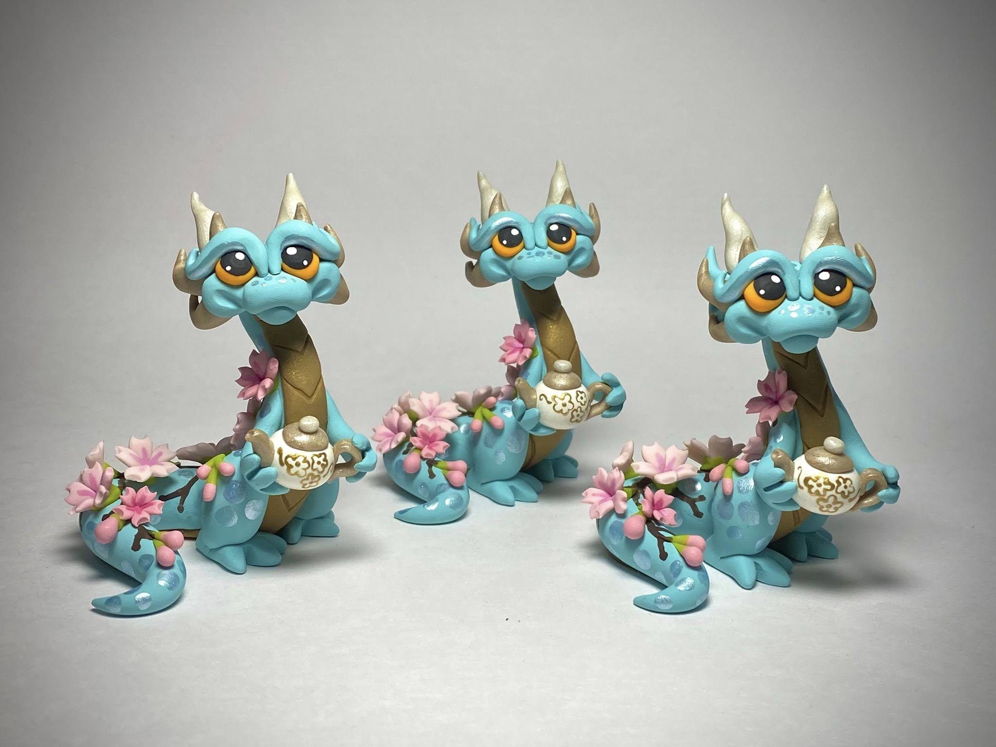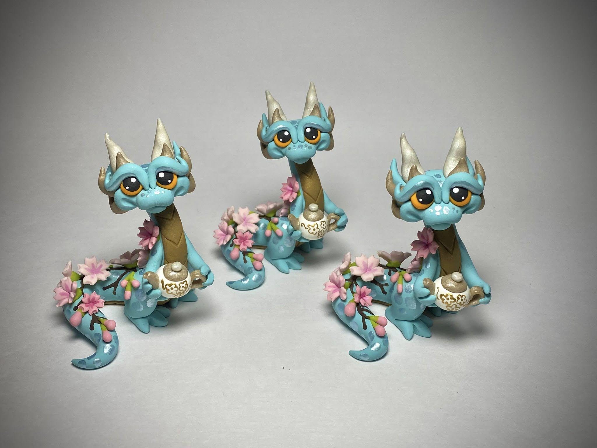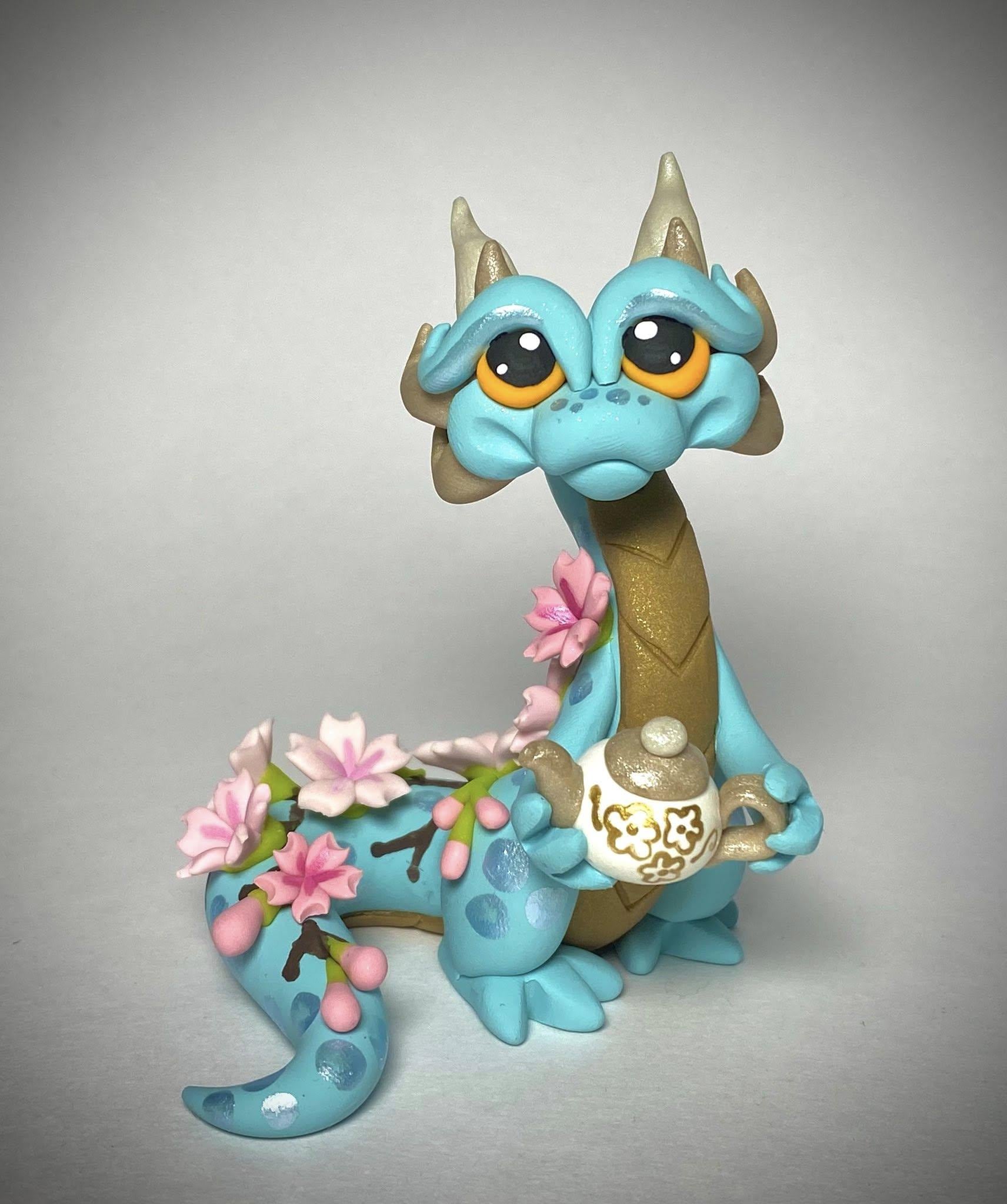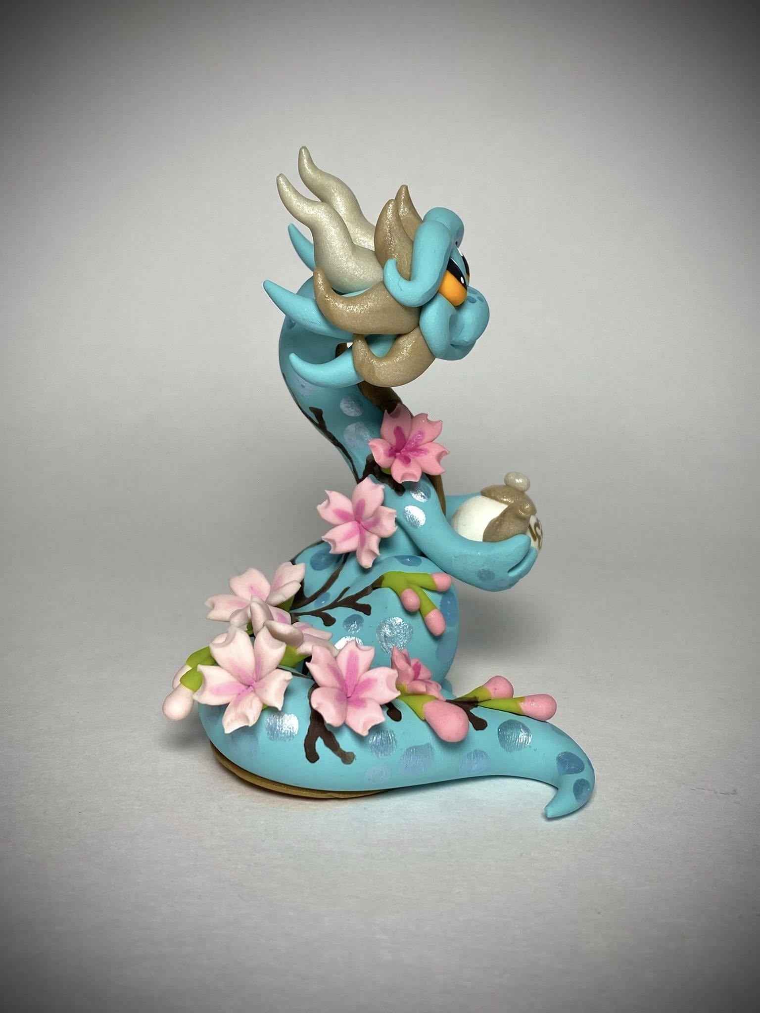 This calming Dragonling is the essence of Spring, covered in delicate cherry blossoms and offering you some hot tea! Every single element is hand sculpted individually without use of molds or 3D prints. This is an original design, available for a limited time!