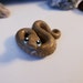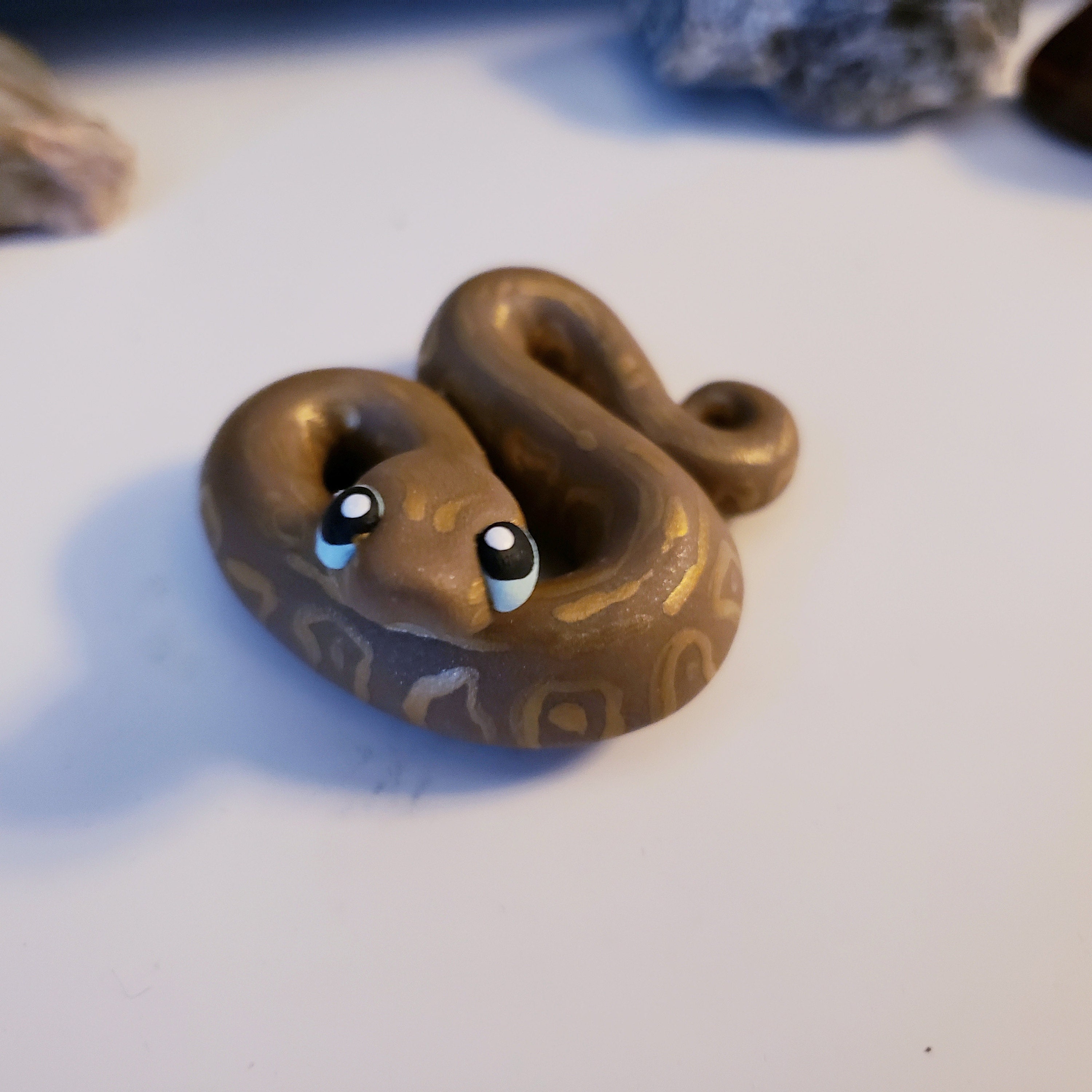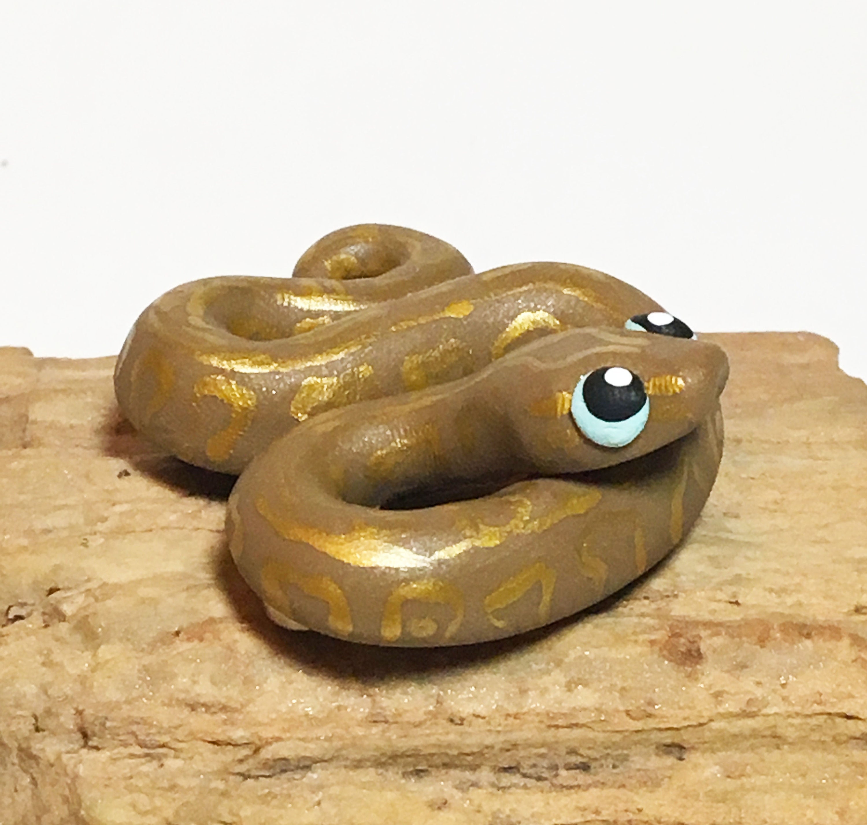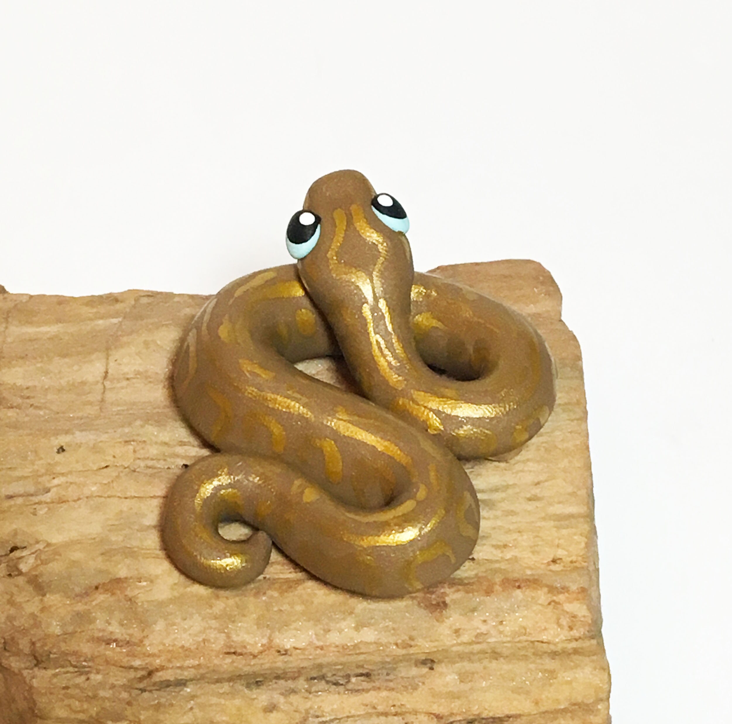 These tiny sneks are all cute, sometimes hidey-shy, and never mean! They can sit on a horizontal surface to hang out while you work, or can be used as small slithery fridge magnets. Each snake is uniquely made without molds.