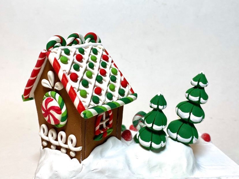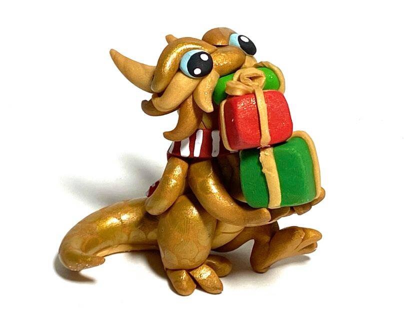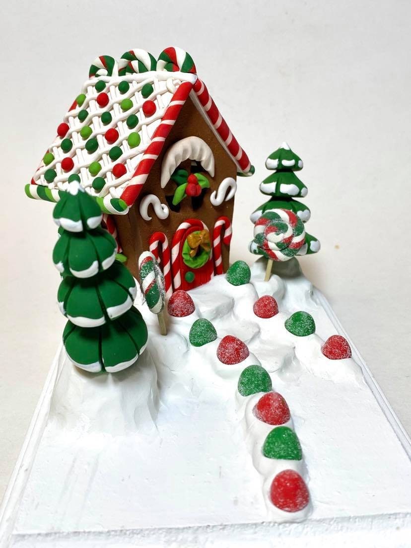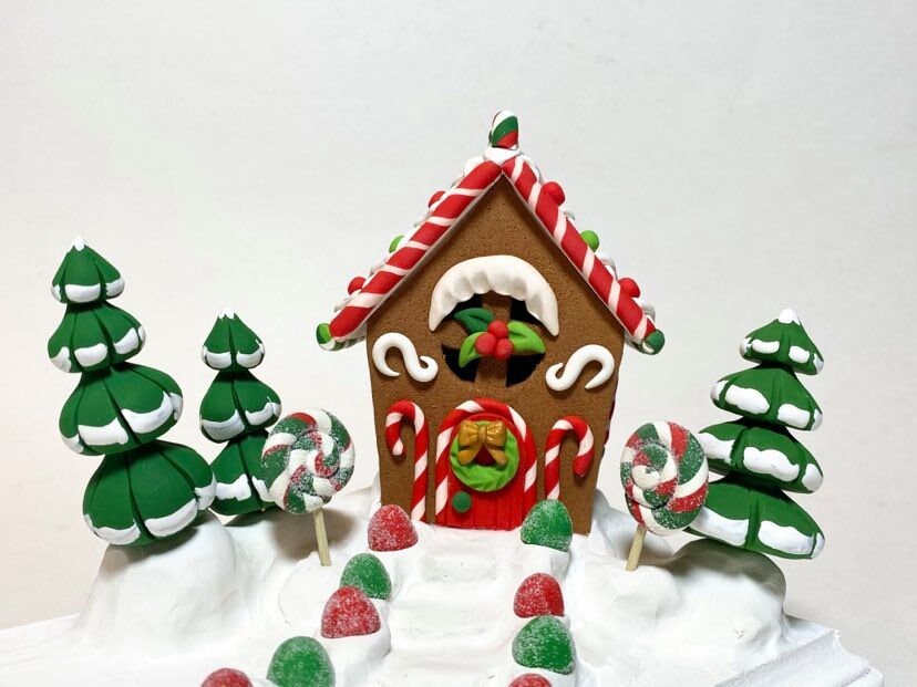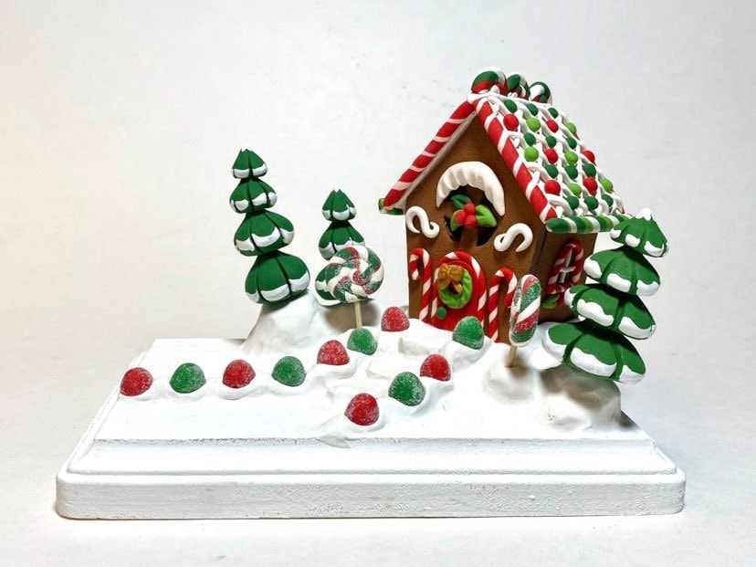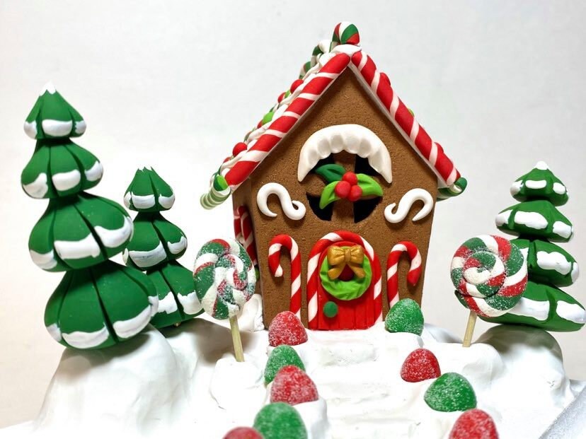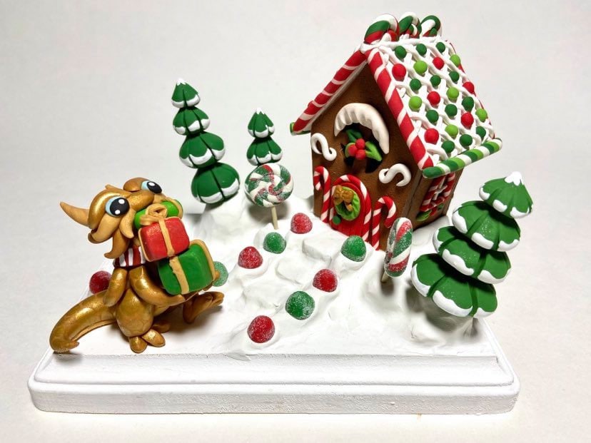 This adorable scene, "Gingershack Delivery," was conceived and sculpted entirely by hand. The whimsical winter wonderland scene features magical lollipops, candy canes, sparkling gumdrops, and the most charming little gingerbread house you could ever imagine! To top if off, the scene comes with a precious gold mini Dragonling, making a special gift delivery! The Dragonling is not attached to the piece, so you may pose it on or off the scene, as you like. You can also add more accents and decorations to the scene, if desired! The piece is sculped on top of a 5x7 wooden base, and finished with felt feet on the underside to prevent scratching surfaces. The one-of-a-kind sculpture also includes a holographic "Dragonlings by Emizart Signature Series" sticker of authenticity beneath. Every element of this story-scene was carefully sculpted and painted with great care, and I hope it brings you much joy in the years to come!